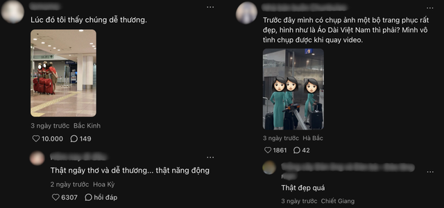 Ngoài ra, chiếc áo dài màu xanh quen thuộc của hãng hàng không quốc gia Việt Nam cũng vô tình xuất hiện trong bài đăng này. Một cư dân mạng quốc tế dù không chắc đây là Áo dài nhưng thừa nhận bộ trang phục mà mình vô tình ghi hình được rất đẹp, khiến họ lưu giữ hình ảnh đến tận hôm nay.