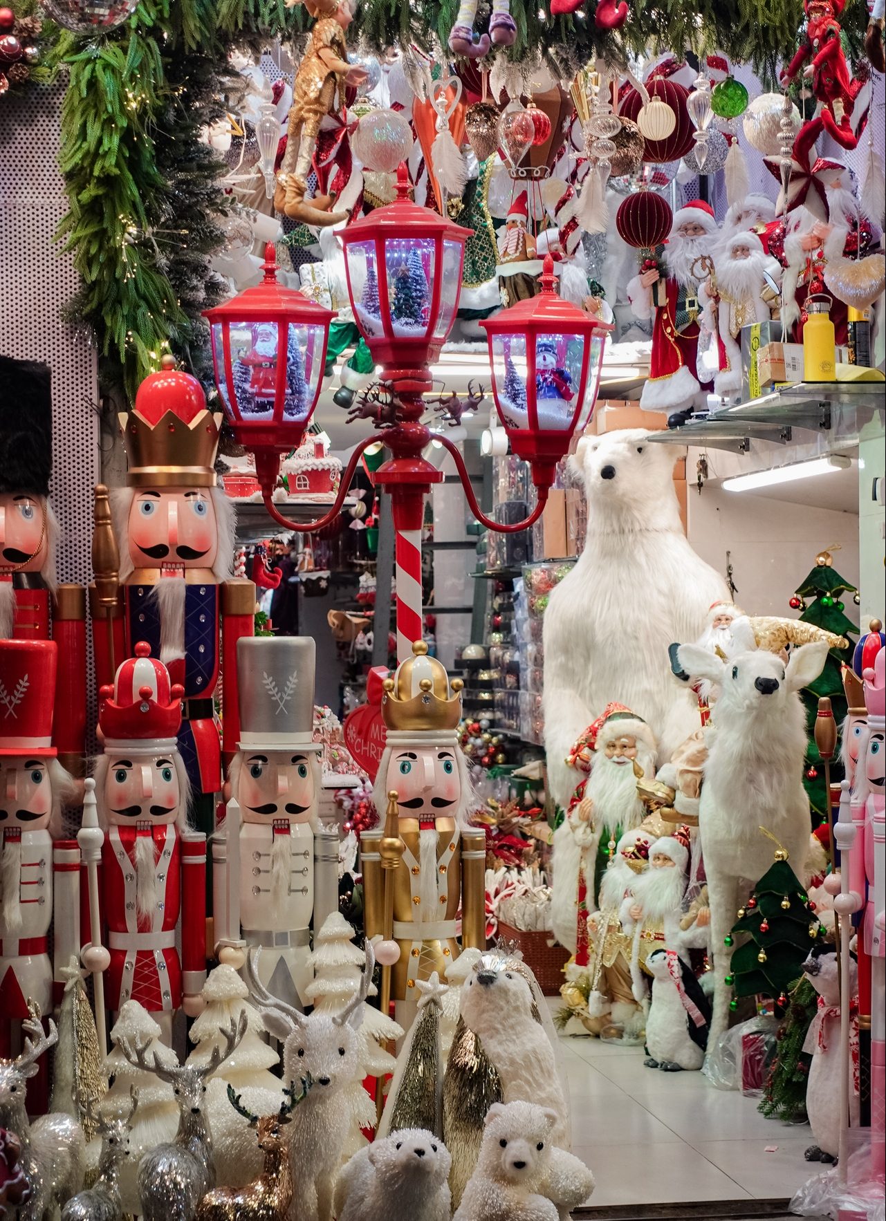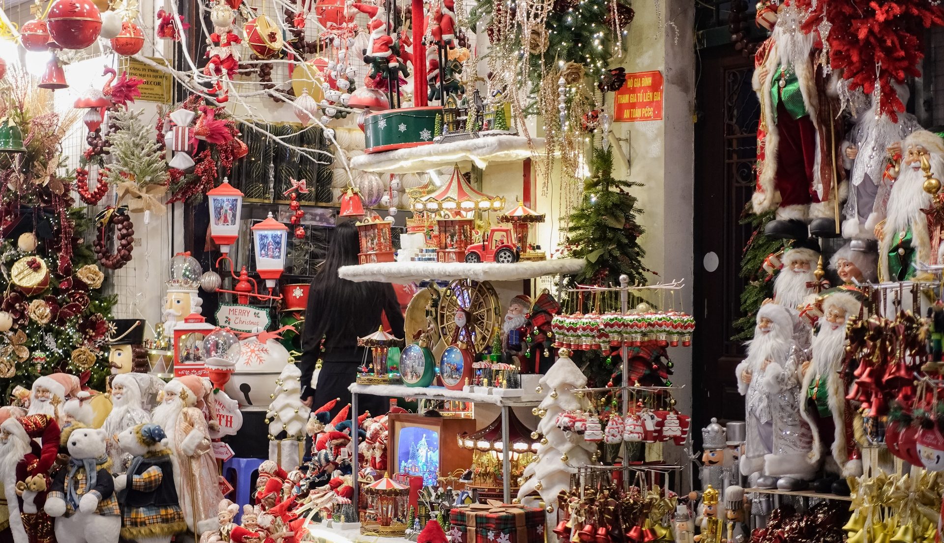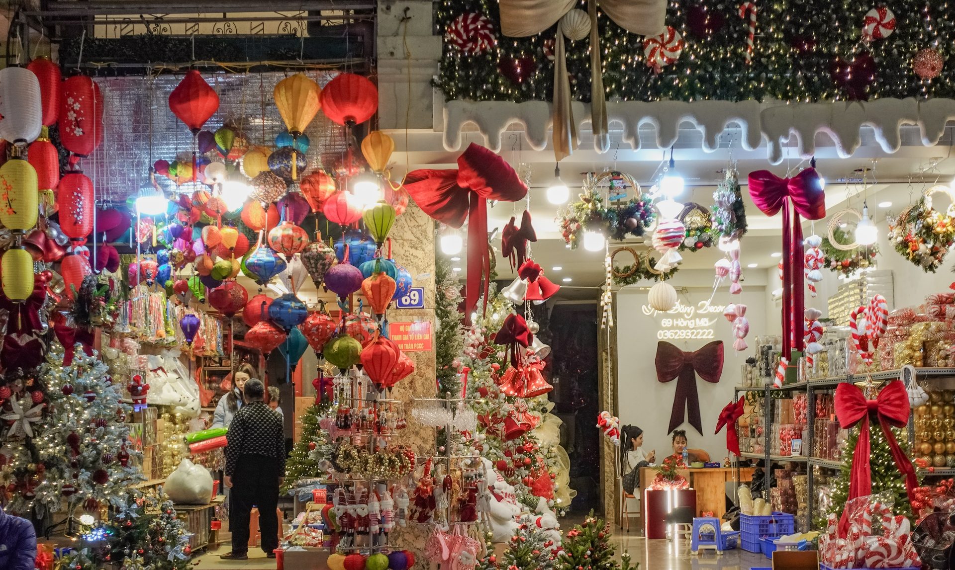 Bên trong mỗi cửa tiệm vẫn là thế giới sắc màu quen thuộc: cây thông, tuần lộc, đồ trang trí, quà tặng lễ hội, phụ kiện… được sắp hàng thẳng tắp, gọn gàng. Sắc đỏ, vàng, trắng, xanh hòa vào nhau, tạo nên một bức tranh thị giác sống động mà vẫn giữ được sự trật tự.