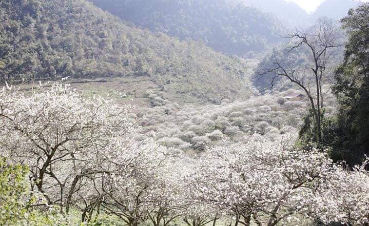 Vào chính vụ, cả thung lũng trắng xóa, những lối mòn nhỏ len giữa vườn mận tạo nên khung cảnh vừa hùng vĩ, vừa rất điện ảnh. Đây là nơi dễ bắt trọn những bức hình toàn cảnh, hợp với váy dài, áo len sáng màu và phong cách chụp “nàng thơ”.
