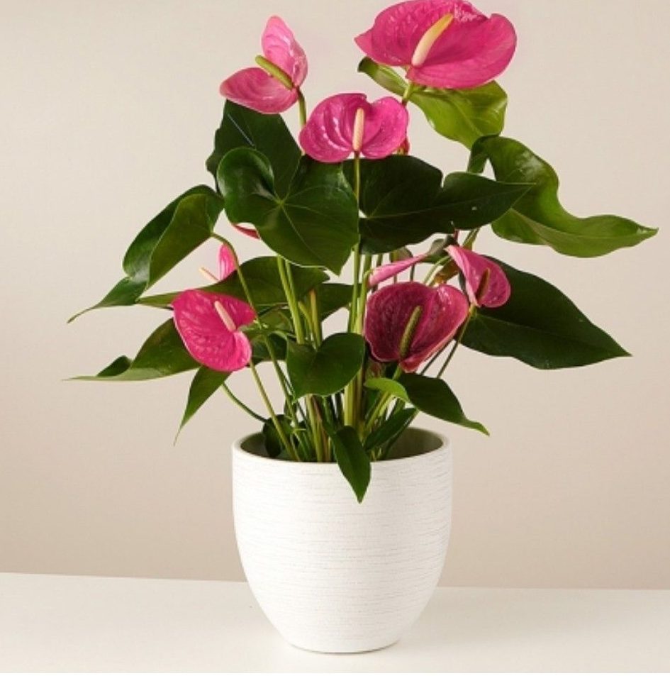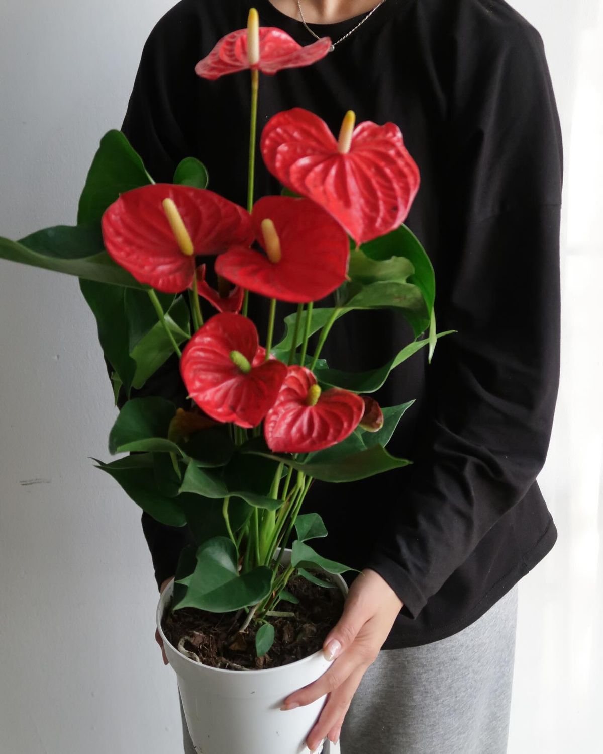 Chậu hồng môn nhỏ có thể đặt ở bàn làm việc, phòng khách, kệ tivi hoặc góc cửa sổ, giúp tạo điểm nhấn tươi sáng. Với sắc đỏ tượng trưng cho may mắn – tài lộc – hạnh phúc, hồng môn còn là món quà ý nghĩa để biếu người thân, bạn bè dịp Tết.