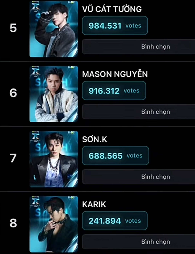Ngay sau Top 5 là Mason Nguyễn với hơn 900 nghìn lượt vote, tạo nên một cuộc “rượt đuổi” thú vị.