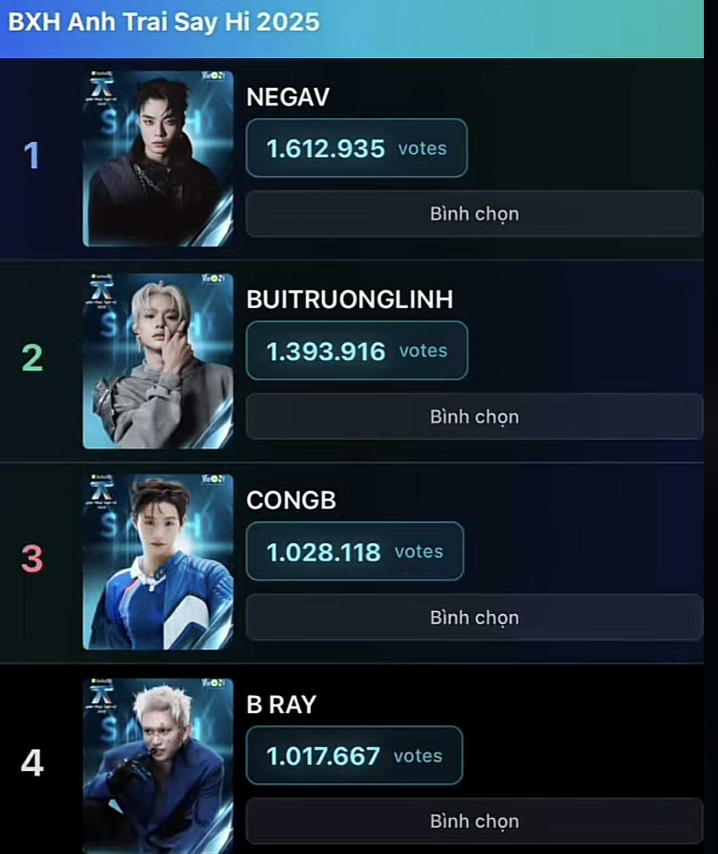 Negav đang dẫn đầu bình chọn với hơn 1,6 triệu lượt vote (bình chọn). Xếp sát ngay sau là Bùi Trường Linh (gần 1,4 triệu vote), B Ray (1 triệu vote), CongB (1 triệu vote) và Vũ Cát Tường (gần 1 triệu vote).