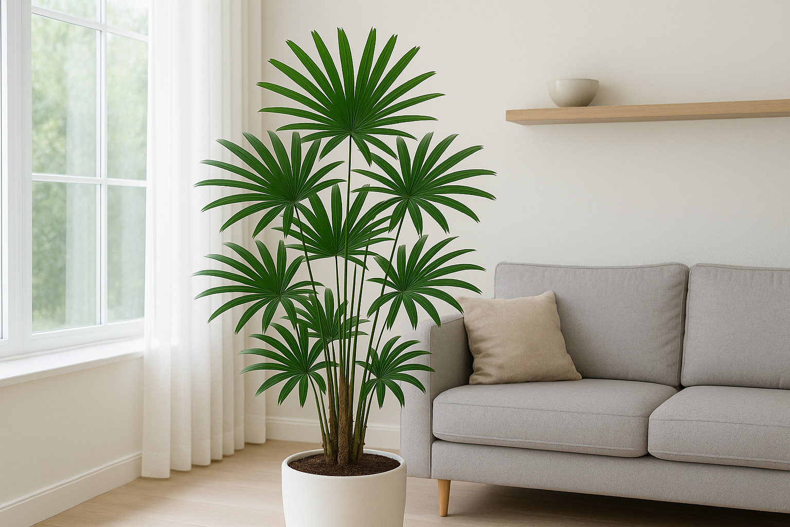Không chỉ mang ý nghĩa phong thủy, trúc cọ còn được mệnh danh là “máy lọc không khí tự nhiên”. Cây có khả năng hấp thụ khí độc, bụi mịn và kim loại nặng, giúp thanh lọc không gian, tạo môi trường sống trong lành.