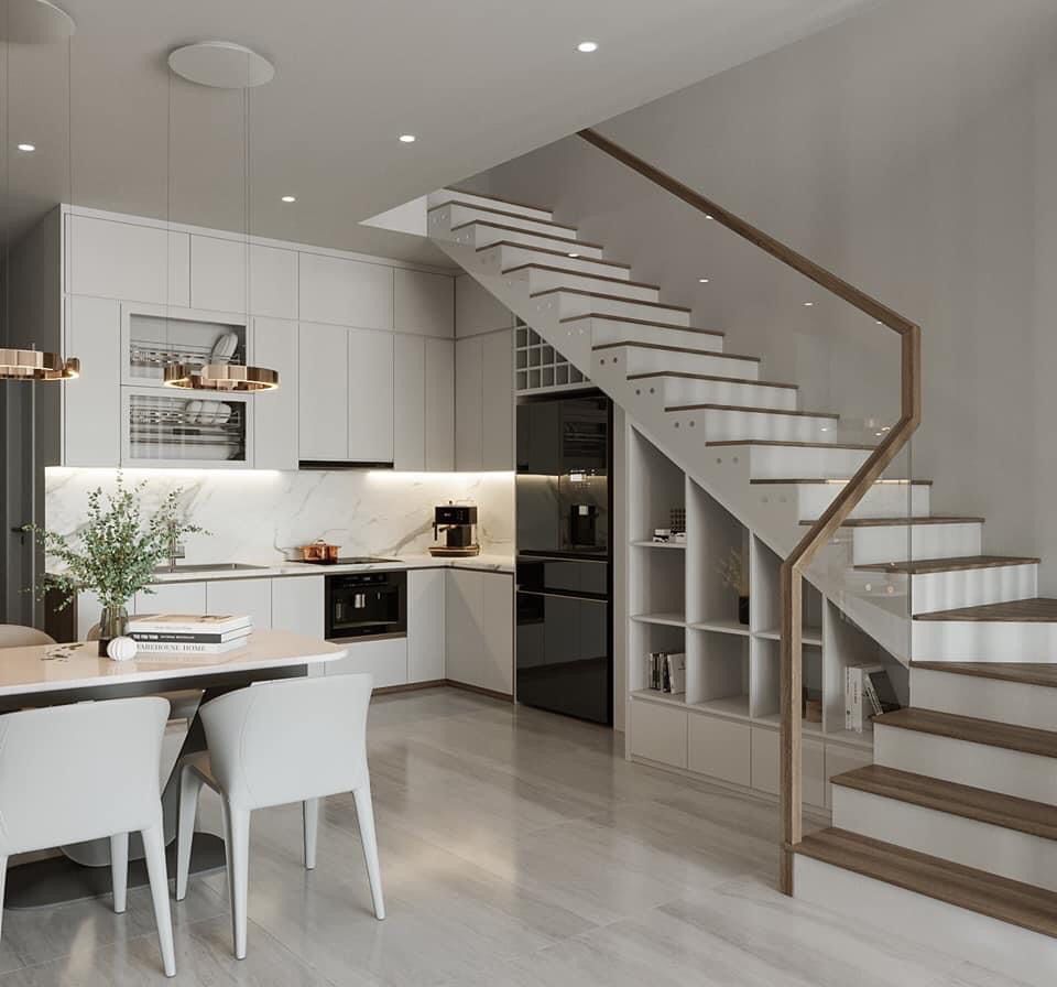 Không gian dưới gầm cầu thang cũng có thể biến thành phòng bếp nhỏ, giúp tận dụng tối đa diện tích và giữ nhà luôn gọn gàng.