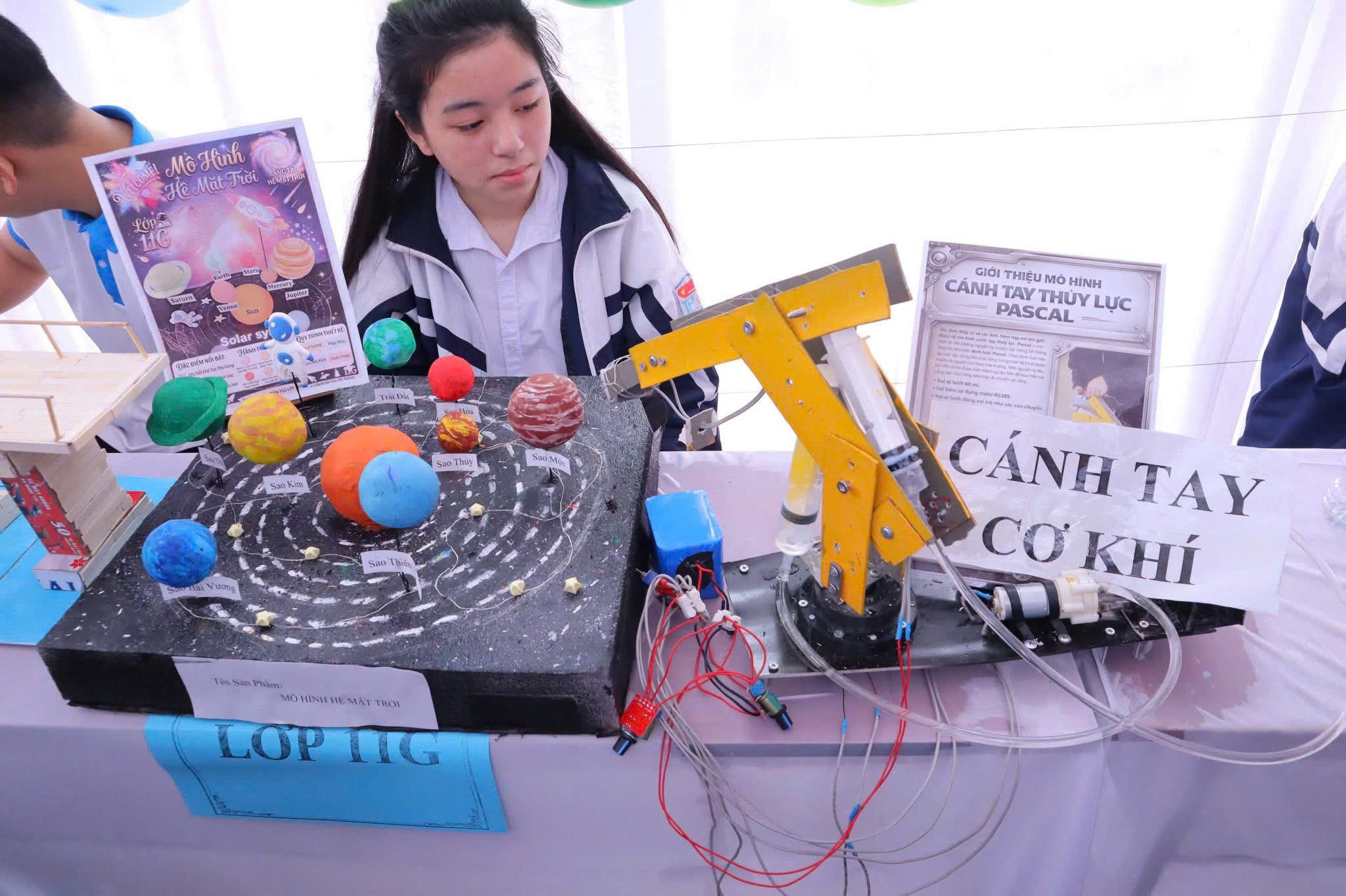 Đặc biệt, khu vực trải nghiệm STEM đã thu hút sự quan tâm lớn với nhiều sản phẩm khoa học do học sinh tự nghiên cứu và chế tạo. Việc trực tiếp thuyết minh, trình bày ý tưởng và ứng dụng của sản phẩm giúp các em rèn luyện tư duy logic, kỹ năng giao tiếp và khả năng thích ứng với yêu cầu của thời đại số.